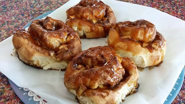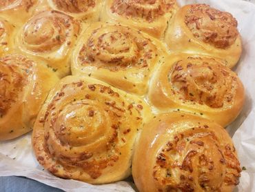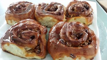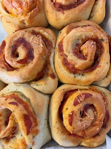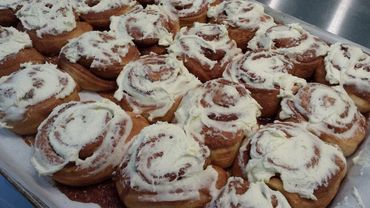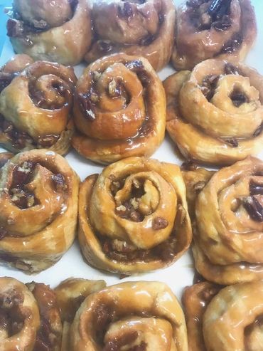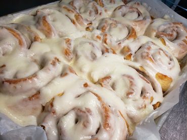 Homemade Dough, Rolled with Cinnamon, Sugar and Real Butter, Iced with Homemade Buttercream Icing.
